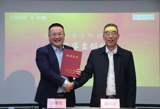 姜春生和王方代表双方签订捐赠协议。曲永岗向上海华测公司颁发了捐赠证书。