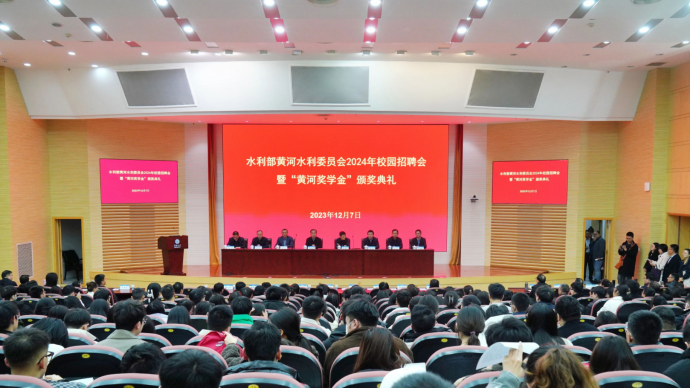 会上,黄委人事局人才处处长蔡延宾介绍黄委2024年招聘岗位计划,黄委的相关单位领导就本单位的招聘做进一步的说明,并播放黄委宣传片《大河之门》。本次招聘会吸引近600余名学生参加,涉及水利水电工程、水文学及水资源、环境工程等水利相关专业,兼具新闻、法律、会计、信息化等专业,此次“黄河奖学金”的设立是黄委人才招聘工作的前移,更是学校“招生-培养-就业-校友”系统融合机制的有效践行。今后,我校将持续做好与水利部黄河水利委员会的人才输送合作,努力搭建校企合作平台,加强多元化就业市场建设,全方位做实做细就业指导帮扶,全力支撑毕业生高质量就业,共绘黄河流域水利高质量发展壮美画卷。