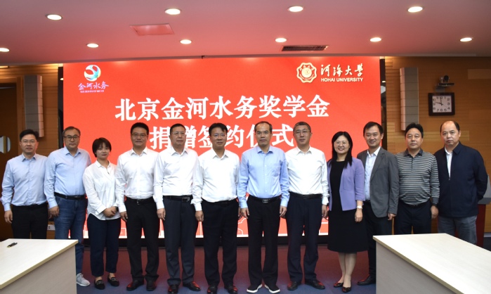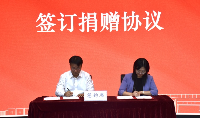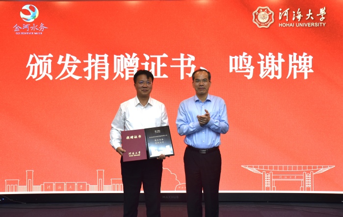 仪式上,双方共同签署捐赠协议。郑金海代表学校向北京金河水务建设集团颁发了捐赠证书和鸣谢牌。