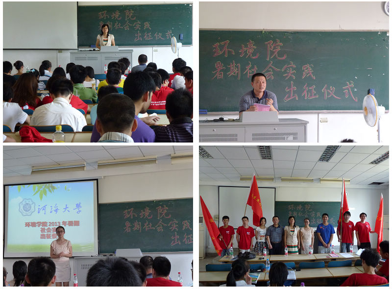 2013年7月11日,环境学院在致用楼118教室启动了暑期社会实践出征仪式,校团委吴红书记,院党委曹松祥副书记、院团委曾莉老师、各年级辅导员及所有团队都参与了这次活动。
