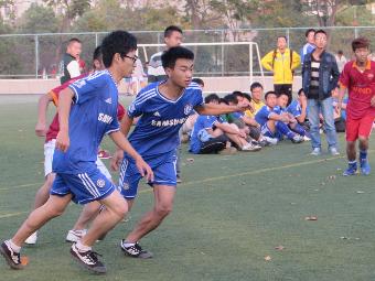 四点钟之前,双方球员便已准备就绪,等待着比赛的开始。环境院球员身着火红的球衣,犹如朵朵浮动的火苗在球场上闪动。他们精神抖擞,信心满满。