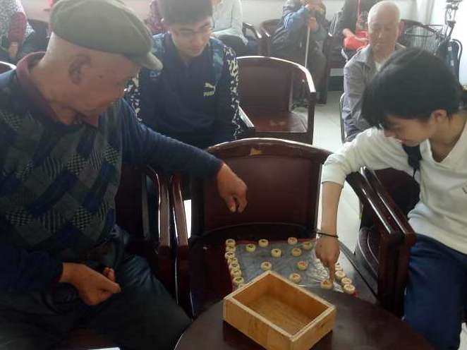 即使在敬老院,老人们也有自己的爱好,他们有的喜欢下象棋,有的喜欢唱歌。青协志愿者们轮流陪他们下象棋引得老人十分开心,老人的棋艺十分高超,志愿者连连败下阵来,场面紧张。