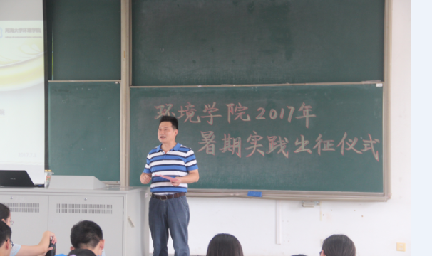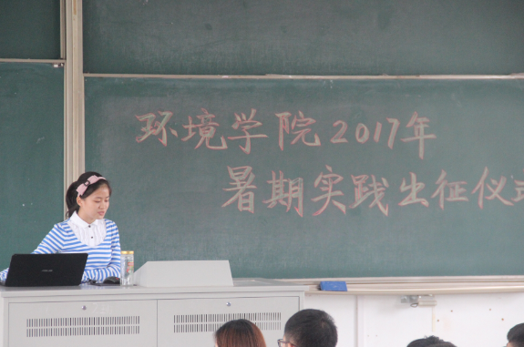 7月3日上午9点,环境学院在致用201教室举行了2017年暑期实践出征仪式,此次活动旨在让同学们更好的进行暑期的社会实践活动。环境学院党委副书记曹松祥、团委书记曾莉和16级辅导员金意倩出席了本次出征仪式。
