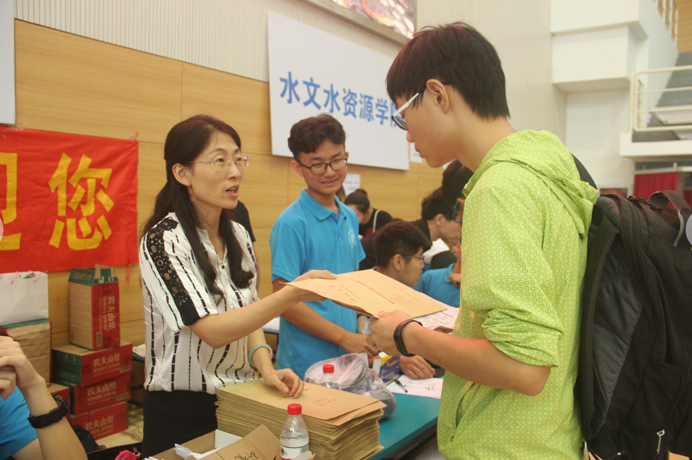王沛芳院长等一行人首先来到文体中心对16级迎新工作志愿者同学表示慰问,向现场学生和家长表示欢迎,介绍了环境学院的具体情况,并向家长了解学生的成长经历。王芳沛院长和笪学军书记亲自为新生发放入学相关资料。