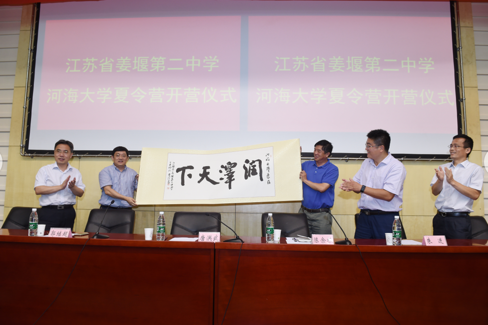 姜堰二中陈余根校长介绍了该校与水利事业的渊源和近年来学生的发展状况,对我校与姜堰二中多年来选拔和培养优秀学生,实现校际互访,开展科技文化交流,实现共同进步和发展的工作表示肯定。随后,陈校长向我校赠送了书有“润泽天下”字样的卷轴,表达了与我校全面开展校际交流的希冀。