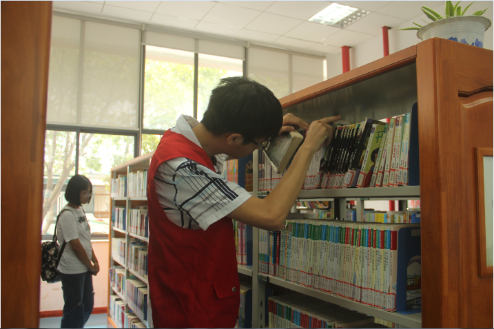 下午一点半,志愿者们准时到达图书馆,穿好青协制服,兵分两路开始了各自的工作,此次志愿服务有二楼成人借阅处的书籍整理和一楼少儿借阅处的书本借还。