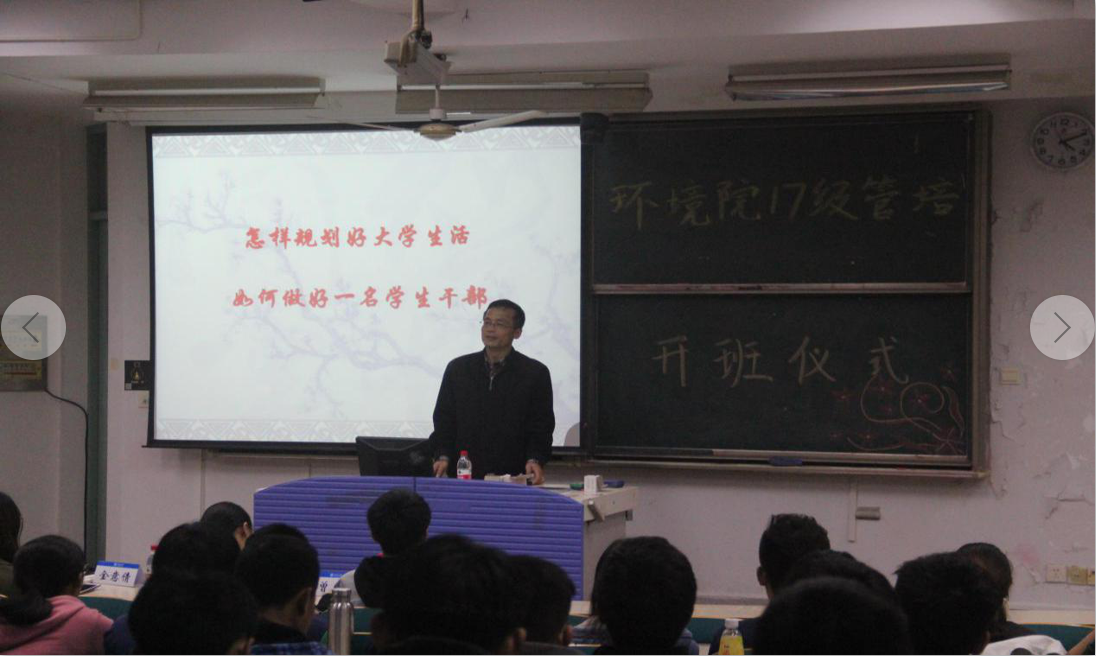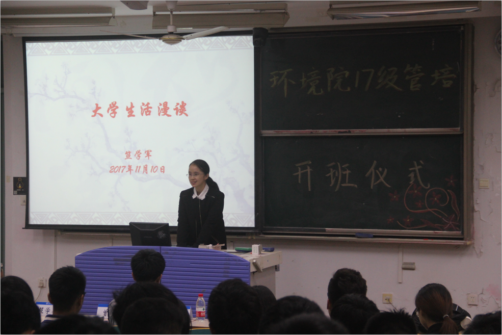 2017年11月10日,开云电竞网环境学院17级管培开班仪式于高b201教室举行。本活动的主讲人为环境学院党委书记笪学军,主持人为院团委书记兼任14级辅导员老师曾莉,另外16级辅导员老师金意倩,17级辅导员老师钮青也出席本次活动。