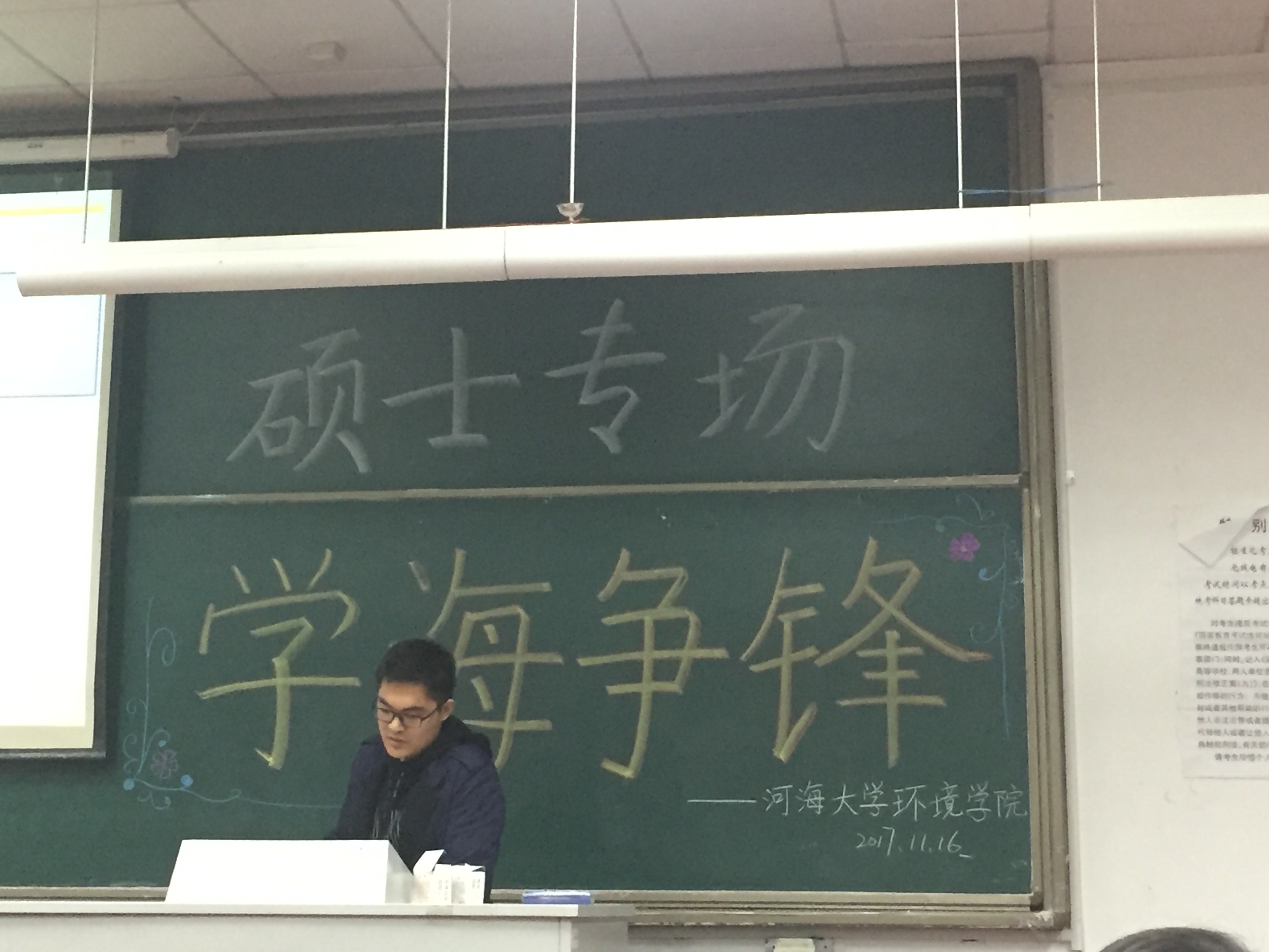 2017年11月16日下午,由环境学院研会研科协策划并举办的“学海争锋——硕士专场”学术讲座于水利馆B101教室举行。本次讲座的三位主讲均是环境学院优秀的研究生,都是今年国家奖学金的获得者,分别是16级市政工程专业的曹臻、15级市政工程的张佳男、15级环境科学与工程的沙海涛。