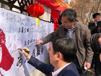 唐洪武书记对环境学院响应教育部的号召,结合关于推进生活垃圾分类管理工作的相关要求而设计的志愿项目表示认可,并与郭继超副书记在横幅上留下他们的姓名,告诉青年志愿者们要将学雷锋活动常态化。