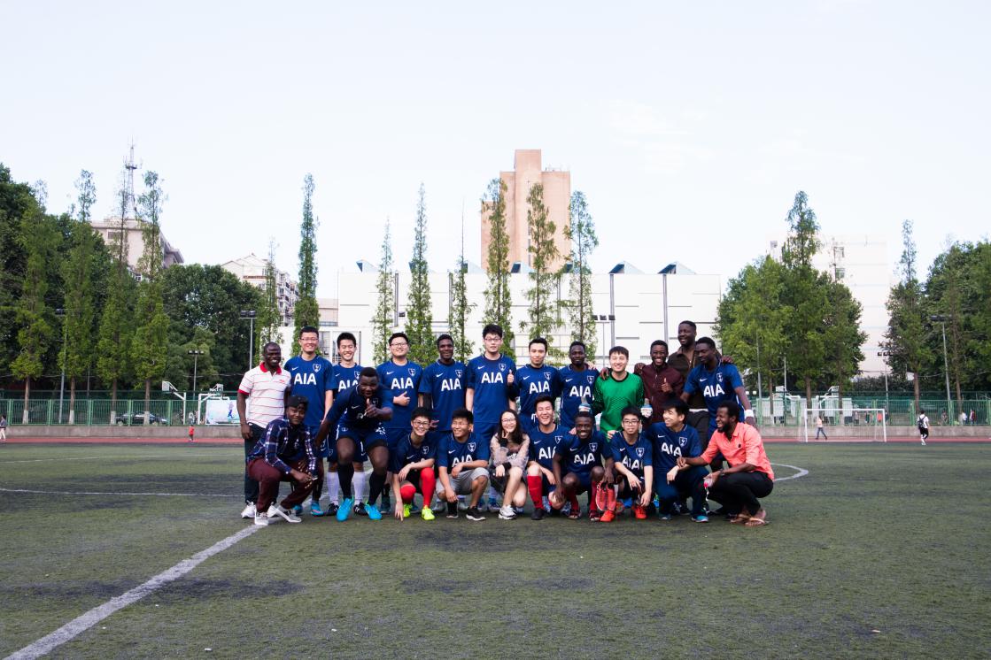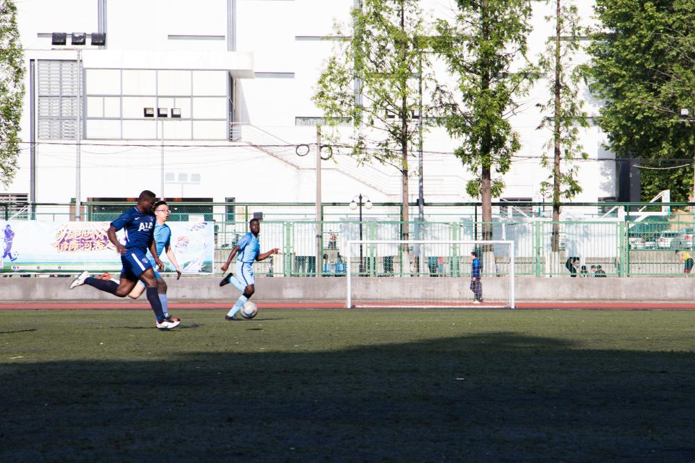 上场之前队员们在场上进行了充分的热身运动。比赛一开始,环境院就占据主动优势,连续的进攻打得上届冠军港航院无力招架。上半场快结束时环境院赢得了一个任意球机会,由77号Robert主罚。裁判哨音刚落,Robert大力抽射直挂球门死角,帮助环境院取得了领先!