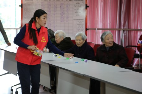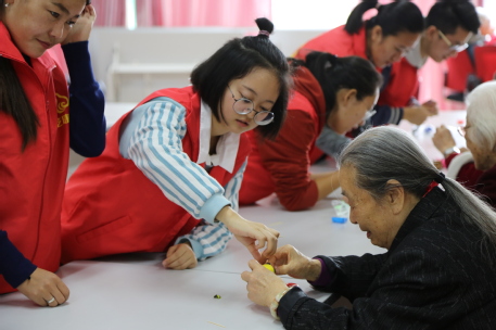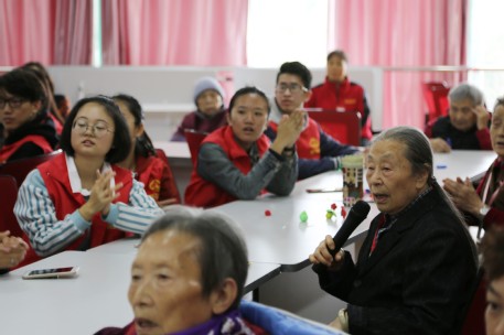 在简单展示了老人们的手工作品后,志愿者组织进行“击鼓传花”游戏,被抽中的同学表演了精心准备的舞蹈,还和老人们一起唱老歌。欣赏着优美的歌声,看到老人们幸福的神色,志愿者们笑得格外甜蜜。