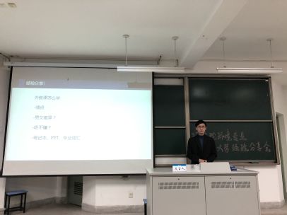 之后带来报告的是16级的潘哲祺同学。在分享心得之前,他先对环境专业的学习情况做了简要介绍。此次交流,他主要为同学们带来外教课的学习经验。在向大家分享了外教课的一些笔记整理后,潘哲祺同学还介绍了准备出国的相关事宜。