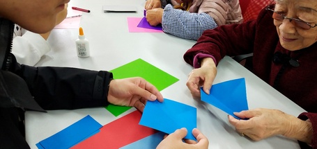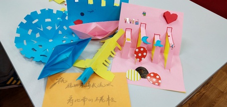 在负责人的带领下,大家摆放好了座椅和手工道具。待老人入座后,志愿者们也纷纷就座并开始和老人们一起制作手工贺卡。刚开始大家还有些生疏,但在观看了相关教学视频以及创意图片后,大家的想法便如同雨后春笋一般冒出。一些志愿者们还巧妙运用了剪纸的技巧,做出了别出心裁的贺卡。