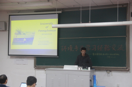 会议第三项是环境学院学生赴其他各国交流学习的汇报。王子悦同学在暑假期间赴美国宾夕法尼亚大学,他首先简要介绍了课程,他们的课程聚焦领导力以及食品安全、水管理、疟疾、老龄化四大全球问题及其解决措施,还深入讨论中美关系及其未来。接着,王子悦同学分析了留学的优点:留学可以让我们去学习先进的东西,填补国家在这个方面的空白,而且可以锻炼学术能力、开拓视野。魏尧同学在暑假期间赴不列颠哥伦比亚大学,她根据自己的经验分析了国内课堂与国外课堂的不同:国内注重课堂授课,而不列颠哥伦比亚大学注重理论与实践相结合,这样可以对人与事有一个更深的认识与理解。王乐阳同学在暑假期间赴加州大学洛杉矶分校,他主要谈了谈自己收获:那里的老师都是来自著名企业的高管,向他们请教是十分宝贵经验,同时,他鼓励同学们不断磨砺自己:为自己而做生活的重担,迟早压在我们肩上,我们离开这学校时,就应该是一座大山了。