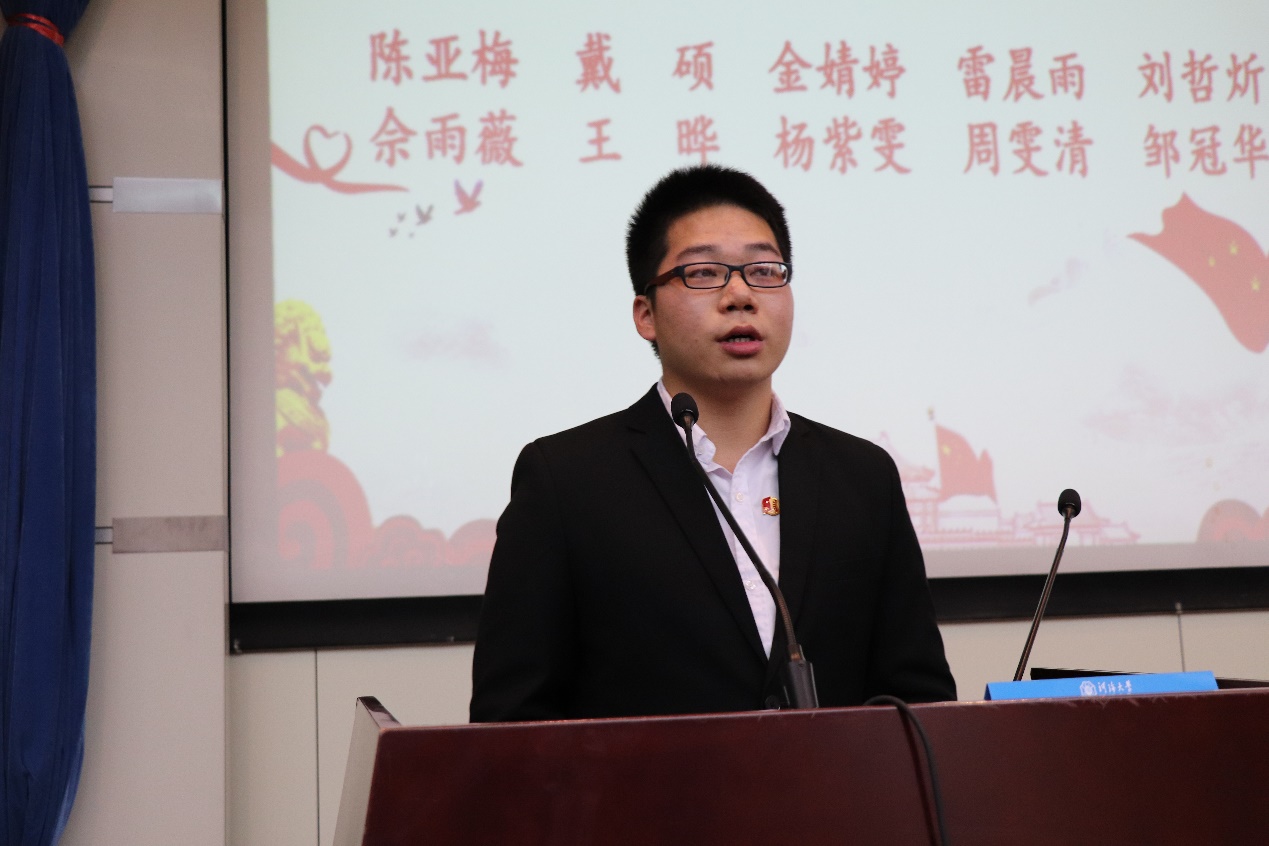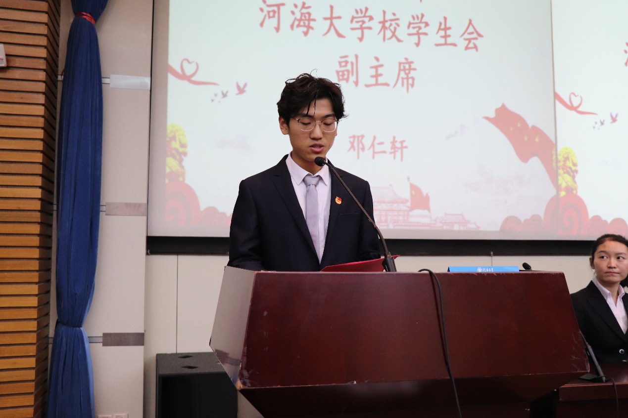 在接下来的学生代表致辞环节,校学生会常任代表邓仁轩同学和校学生科协副主席岳楠同学为开幕式致辞,他们回顾了环境学院过去一年中在举办讲座、参加校运会以及其他工作中的优秀表现和取得的优异成绩,并引用习近平主席对青年一代的期盼,提出对第九届学生会和科协主席团的希望。