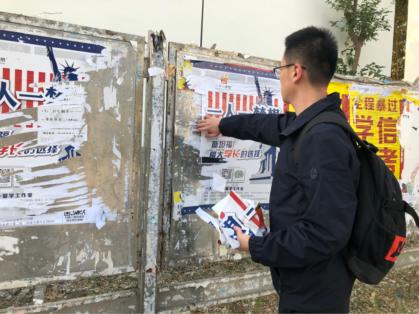 同学们分成了两组,一组将广告栏中的过时海报揭除,一组将六食堂墙上真假难辨的非官方纸张清除。尽管室外温度极低,偶尔还有萧瑟冷风吹过,在没有便捷的清理工具的情况下,同学们仍然认真地清除小广告,不放过其中任何一个。