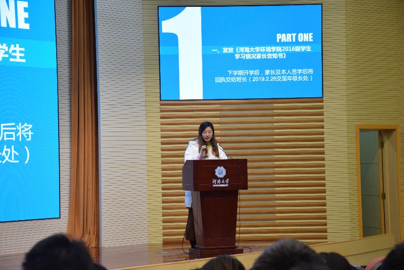 此次年级大会首先播放了一段主题为环境学院2016级本科生2018年度报告的视频,从学风建设、文体活动、精神建设等各方面进行总结。之后由辅导员金意倩老师进一步总结概括2018年各项事宜。