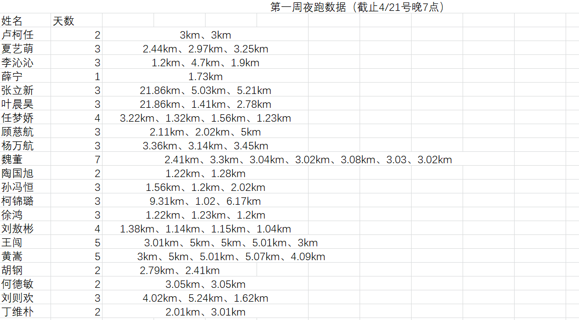 活动目前已进行了一周,大家的参与热度也丝毫不减。规则中只要求一周打卡三次、每次至少一千米,而所有参与人员的打卡次数几乎都超过了这个标准。这也反映出大家是积极地想要去运动的,而不是为了打卡而夜跑。能够自发去锻炼,哪怕只是跑跑步,日积月累,也会对我们的身体有大大的益处。而这也是此次活动的初衷,让所有人开始运动、习惯运动、享受运动。相信每个同学在活动结束后都将有所收获。