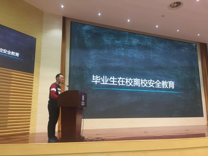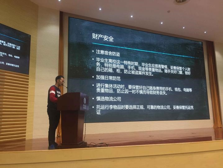 在大会上钱林皓主要从人身安全、财产安全、食宿安全、交通安全、求职安全等几大方面为大家进行讲解,提醒毕业生要注意在校、离校安全。这几分钟的讲解,不仅仅是对毕业生的告诫和提醒,更满载着对众多毕业生能够安全开心毕业的期望。