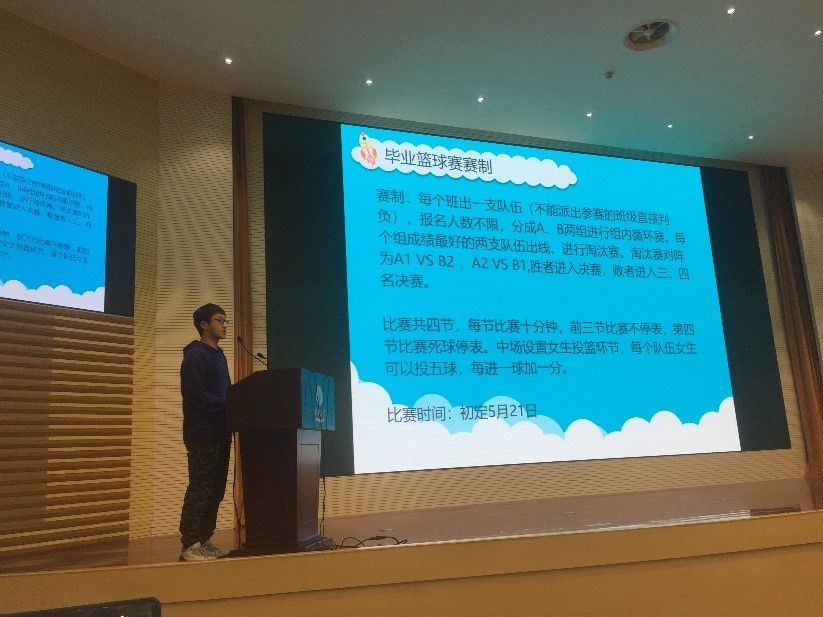会上15级年级长潘泓哲同学首先针对本次趣味运动会的主题、赛制、比赛具体项目与规则进行了详细的讲解。而15级环境一班班长刘斯陶则针对毕业篮球赛的赛制、组队方式以及比赛规则进行了讲解。他们都重点强调了本次活动的趣味性,并充分动员大家积极报名参加。
