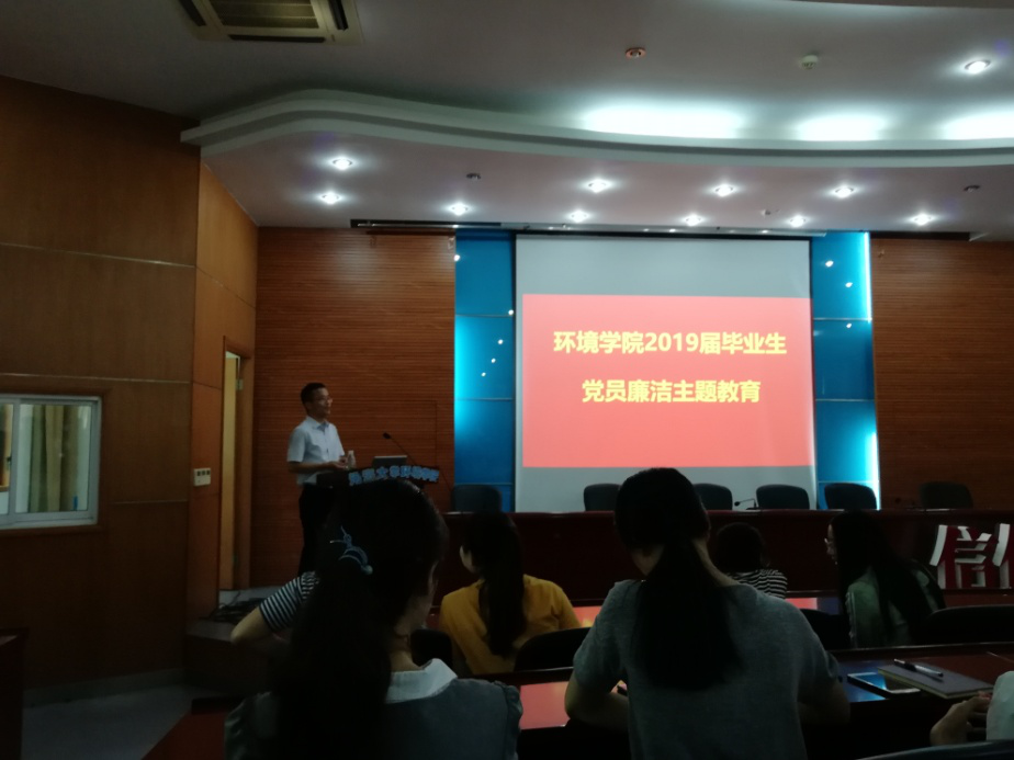 2019年6月12日下午,环境学院全体毕业生党员齐聚水利馆301开展毕业生党员廉洁主题教育活动,学院党委笪学军书记为同学们做汇报。2015级本科生辅导员王剑老师、研究生辅导员高臣老师主持。活动中,笪书记分别从三个方面对每一位毕业生党员提出了中肯的建议并分享了自己宝贵的经验,并在最后真诚地祝福各位同学前程似锦,一切顺利。