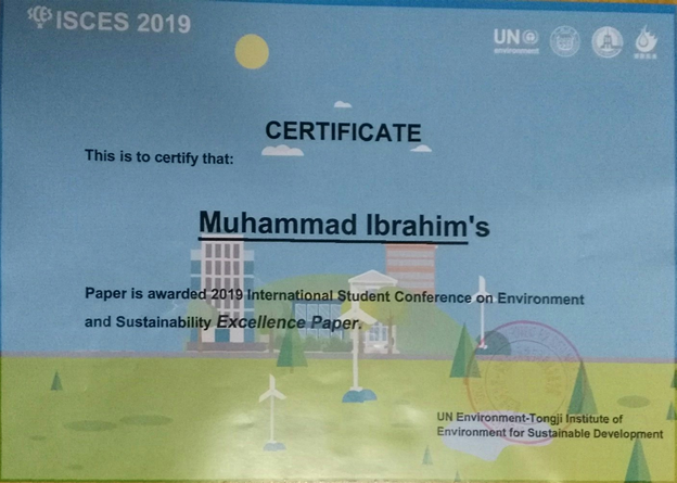 由同济大学、联合国环境规划署、新华社、北京绿色未来环境基金会主办,联合国环境规划署-同济大学环境与可持续发展学院承办,联合国教科文组织、联合国粮农组织等单位协办的2019国际学生环境与可持续发展大会于2019年6月10日~15日在同济大学举行,我院陈德强副教授指导的2018级尼日利亚籍留学研究生Muhammad Ibrahim参加此次大会并获得大会“最佳论文奖”。