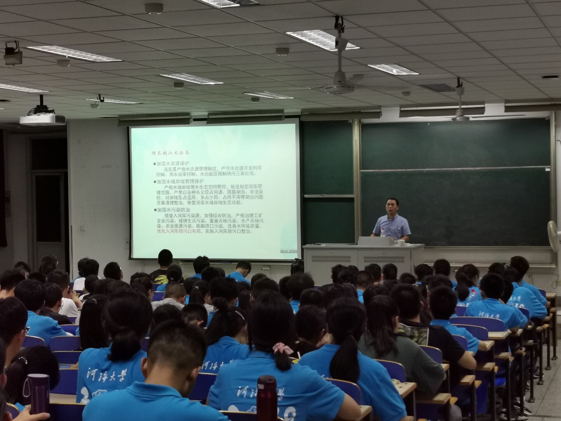 然后,李老师从国家层面给同学们讲了环境学院各专业的相关内容,并以河长制的主要内容作为例子进行讲解。李老师还询问了同学们对未来的规划,并举出往届毕业生就业与升学情况,向同学们分析了保研、考研、出国、就业这四种基本选择所需要的准备,并鼓励同学们正确认识各专业的优势,找准定位,明确选择。