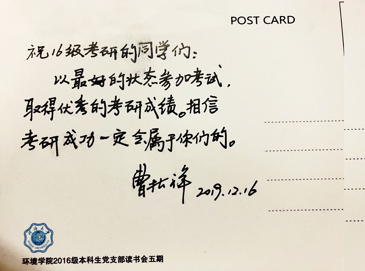 2020考研将至,为帮助环境学院考研学子顺利备考,同时拥有一个积极乐观的备考心态,院党委副书记曹松祥老师、院团委书记兼2016级辅导员曾莉老师、2016级辅导员金意倩都给予同学们鼓励,学院各本科生党支部以及各专业也积极响应发声,写下了诚挚的祝福,给予他们成功的信念与力量。
