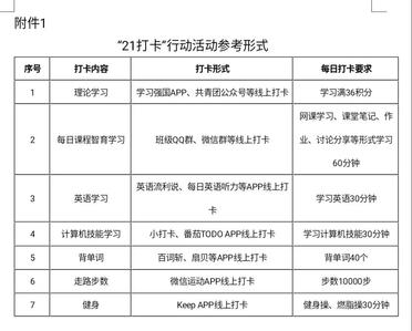 为激发学生主观能动性,促进学生做好时间、目标和行动管理,各班级开展一项或多项能够帮助学生养成良好习惯的“21天打卡”行动。环境学院集中于4月24日-5月14日进行打卡活动,打卡内容多样。