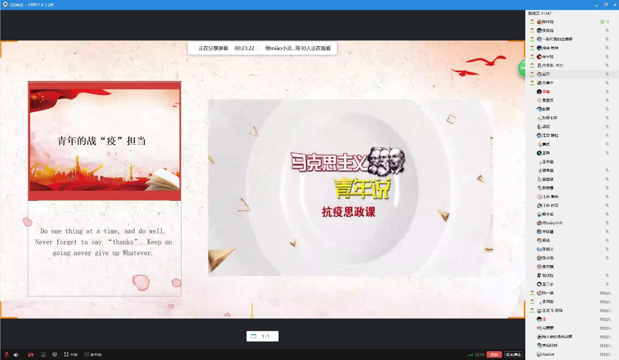 5月15日下午3时,由团支书陈玲珑主持线上班会。班会分为理论学习成果分享、主题宣讲、知识问答、战疫宣传四个部分。