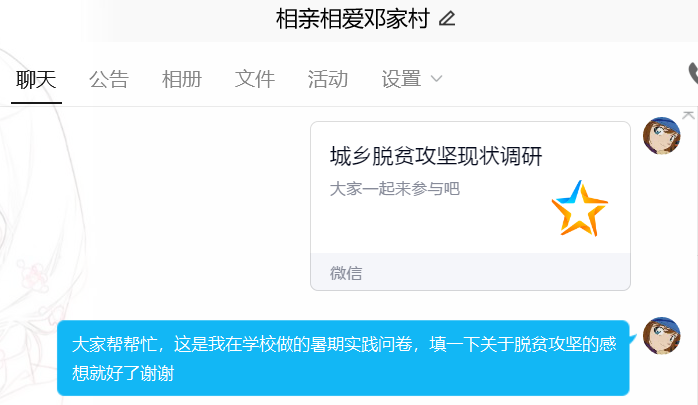 调研小队在线下实地调研的同时也通过不同途径向家乡亲朋好友发放扩散有关于脱贫攻坚战的问卷,问卷内容主要为对脱贫攻坚的了解和部分关于疫情的情况。