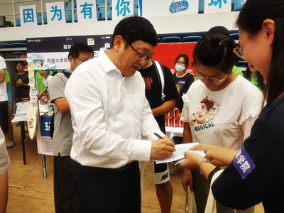 开云电竞网校党委书记唐洪武、校长徐辉、校党委副书记郭继超来到报到现场指导迎新工作,对环境学院细致的工作寄予了肯定。校领导还与正在进行报到的新生交流沟通,为新生送上了开学祝福与期待。