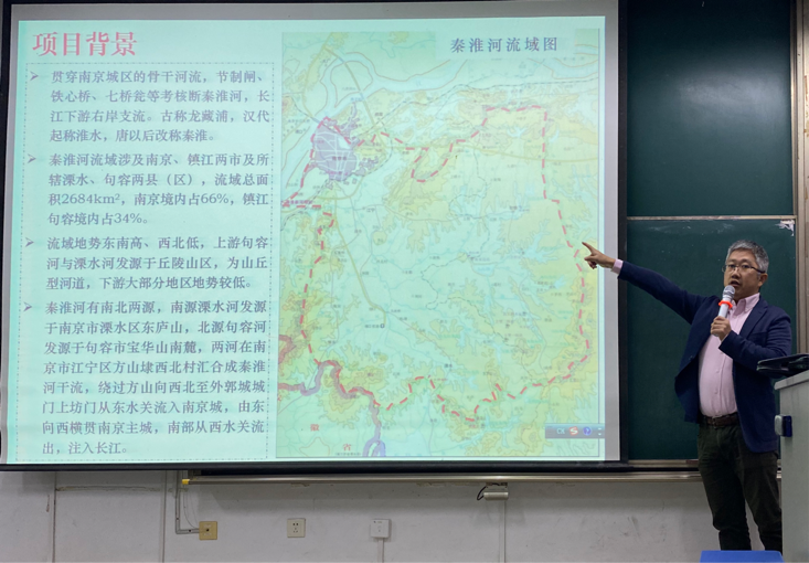 紧接着,王鹏老师从研究区域概况、资料收集与数据库构建、秦淮河流域骨干河道生态基流研究、骨干河道水量-水环境耦合教学模型构建、调度方案的多情形模拟与方案比选几个方案向同学们展示了城市水系和生态水情况。