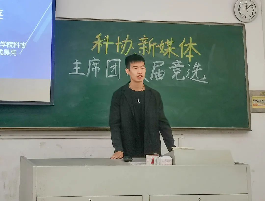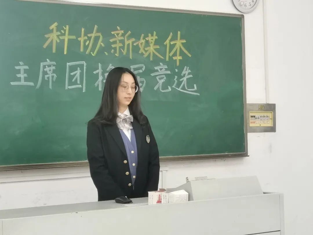 本次竞选共有七位候选人参加。首先进行的是科协的换届竞选。竞选主席的是2018级刘哲炘同学,竞选副主席的是2019级钟尹婕同学和2019级钱昊亮同学。各位竞选人就个人介绍、学生工作经历与成果以及未来展望与策划三个方面进行了PPT展示与个人演说。