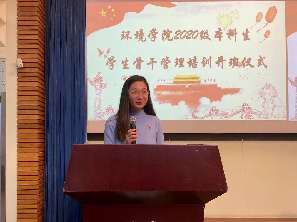 2020年11月26日,为培养政治坚定、作风过硬、素质全面的优秀学生骨干,环境学院召开了2020级本科生学生骨干管理培训开班仪式。会议邀请到环境学院党委书记笪学军老师、院团委书记兼2020级辅导员金意倩老师、2019级辅导员扈雅璐老师、2019级辅导员程萌老师、2020级辅导员杨铮老师。参加本次会议的还有2019级、2020级的环境学院学生骨干。