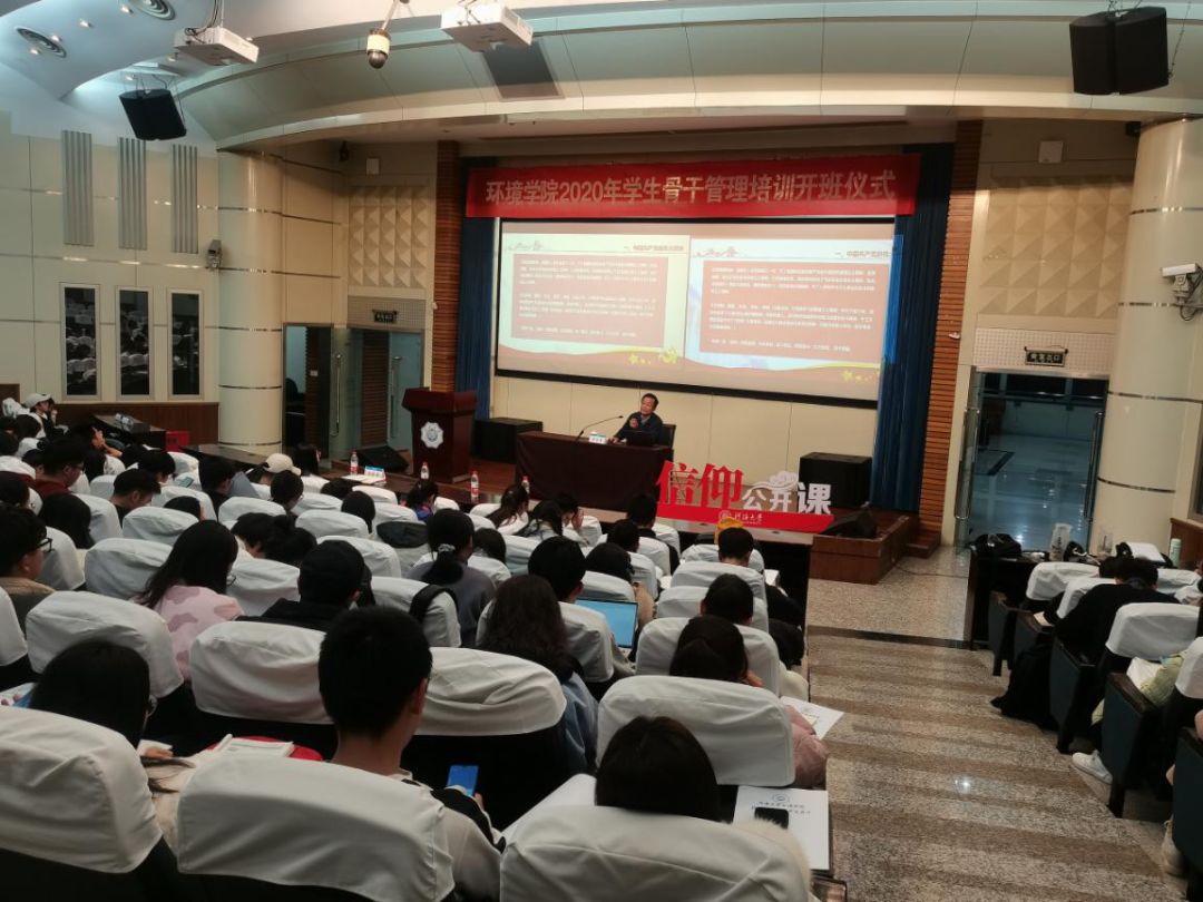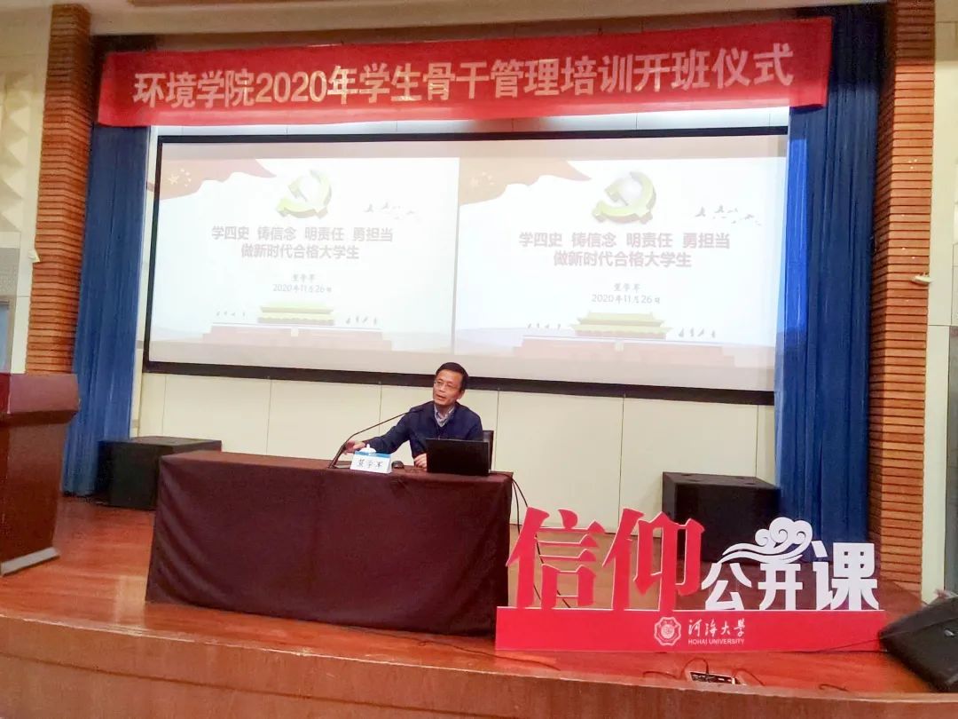 环境学院党委书记笪学军给学院学生骨干们讲述了以“学四史,铸信念,明责任,勇担当——做新时代合格大学生”为主题的信仰公开课,笪书记从“中国共产党的伟大精神”、“当代青年的责任与担当”、“弘扬党的精神、做新时代的合格大学生”三方面谈起,结合当前时政热点,用真实生动的事例和恳切的语言鼓励同学们要提高政治素养、勇担社会责任、争做中国特色社会主义的建设者和接班人。笪书记从延安精神、西柏坡精神、抗美援朝精神讲到今时今日疫情之下,全国人民团结一心、共克时艰。时代在变化,但不变的是中国共产党的生生不息和中国精神的代代相传。