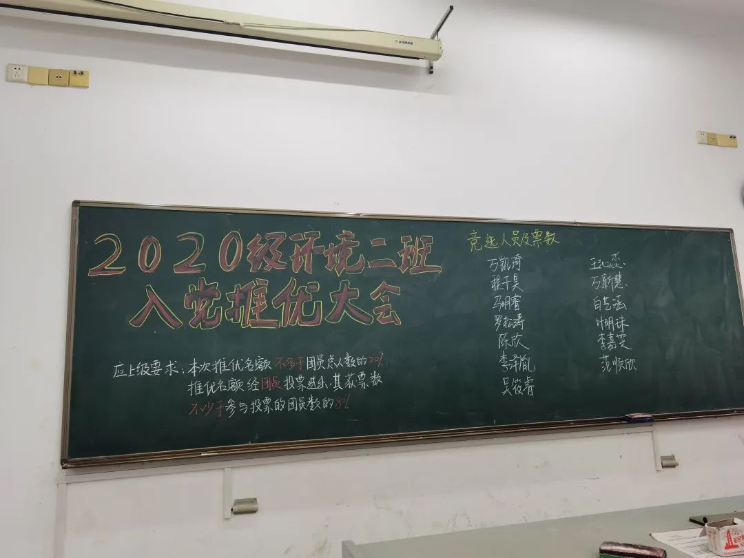 2020年10月18日,2020级环境一班举办了推优班会,同学们通过演讲和投票的方式推选出优秀积极入党分子。整个过程公平公正公开,班会气氛活跃。