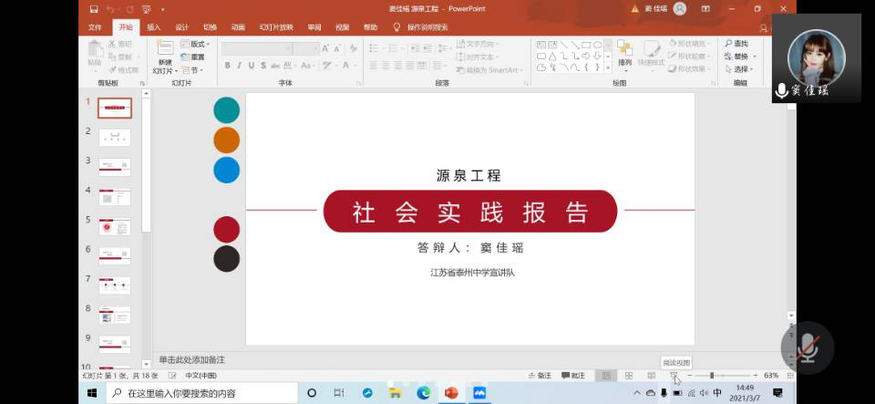 本次答辩一共有8支队伍参加。线上答辩由竞选队伍借助PPT形式阐述工作和评委提问两个环节组成。各位竞选队伍就活动目的、前期准备、宣讲过程以及活动影响等方面展开答辩,各自展示出自己团队在实践中的亮点。而后评委老师们根据答辩人介绍的实践过程和实践成果提出问题,如“通过什么渠道进行宣传并展开线上宣讲的”,“是否介绍过环境学院,是如何介绍环境类专业的”等问题,并提出改进意见,为答辩团队完善实践成果提供了方法论。