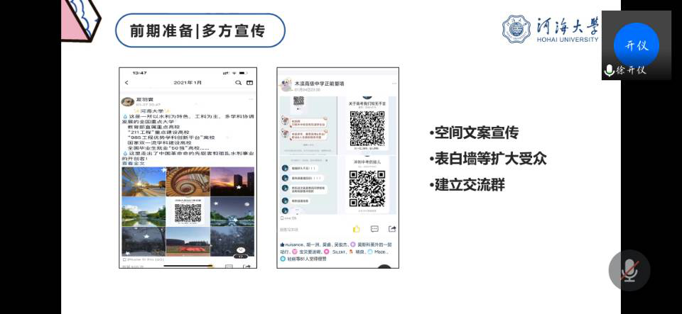 第八组在线下发放宣传材料和充分宣传了开云电竞网之后通过腾讯会议开展了线上宣讲,进一步提高了开云电竞网的知名度,传播了河海文化,弘扬了河海精神。针对各个团队在实践以及答辩中的一些细节,评委老师们也耐心的提出问题和建议,引导同学们继续改进,做出更加优秀的实践成果。