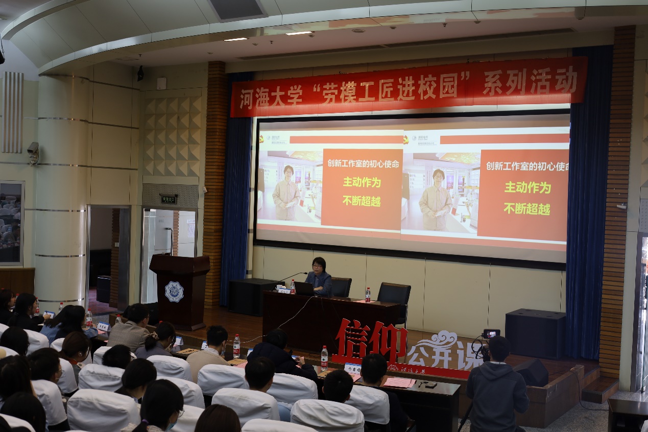 何主任向与会师生作《在实干中担当,在创新中逐梦》主题报告,分享了从一代大学生成为一代劳模的精彩故事和宝贵经验。