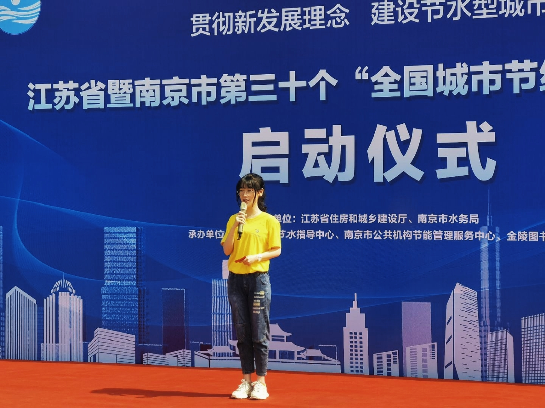 下一项议程为来自南京师范大学的严佳妮同学代表大学生志愿者作节水倡议,她向我们发出了“树立良好节水意识,争创节水型城市”的积极倡议。