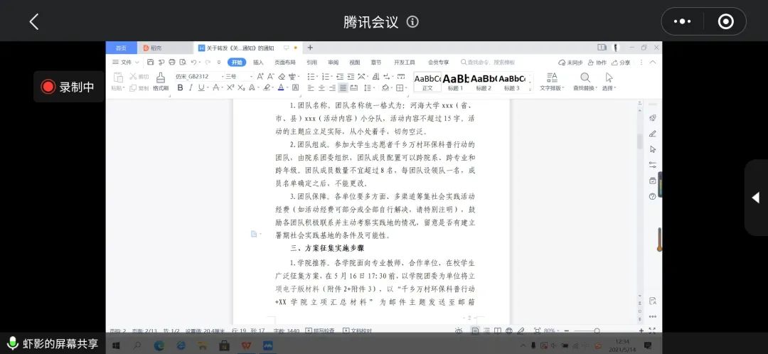 会议伊始,2019级夏颖同学向同学们讲解了2021年“江苏省大学生在行动暨志愿者千乡万村环保科普行动”的所需附件情况、实践流程和答辩时间安排。在夏颖同学介绍完毕后,同学们就自身疑问提出有关于实践和答辩等方面的问题,金意倩老师、夏颖同学耐心地为大家解答,并鼓励同学们加入QQ群进行更细致地了解。