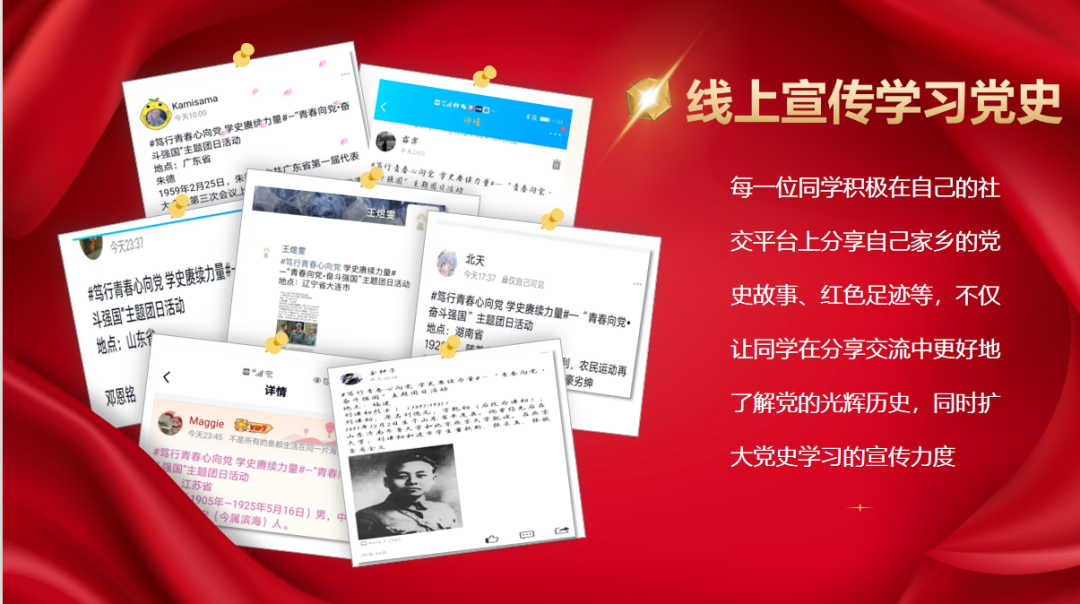 党史是明灯,也是号角。在建党一百周年的重大节点上,各团支部采用多种形式了解党的光辉历史、感悟党的初心使命,践行了党的崇高精神,传承红色基因,让更多学生受感染、有感悟、有共鸣。在党史学习中激发信仰、获得启发、汲取力量,切实贯彻习近平新时代中国特色社会主义思想。