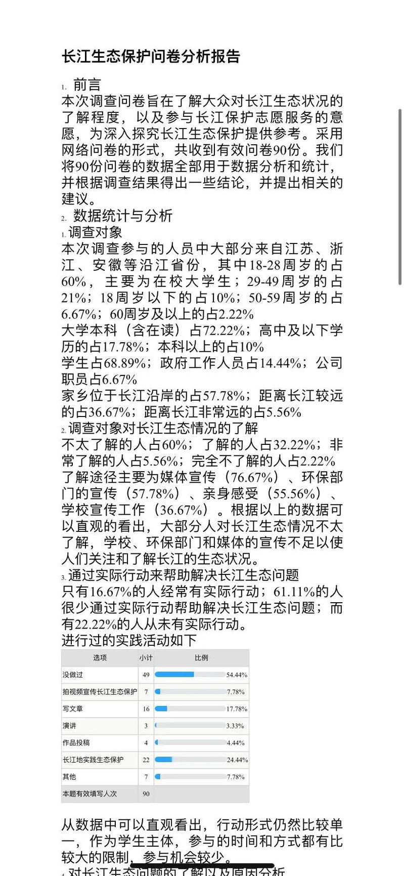 问卷调研分析环节,团队精心制作了一份普及性强的问卷,通过线上方式广泛发布,收集答卷信息。经过缜密的统计,团队结合问卷结果精心制作了南京居民关于长江大保护的调研总结,运用柱状统计和饼状图对得到的数据进行汇总,并对数据揭示的现象做了一份深度分析,从而总结得出长江保护目前的长处与不足,进而提出有针对性的建议,最大化的深挖了问卷的内核价值。