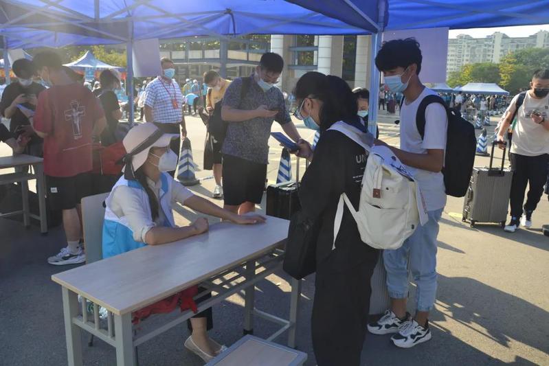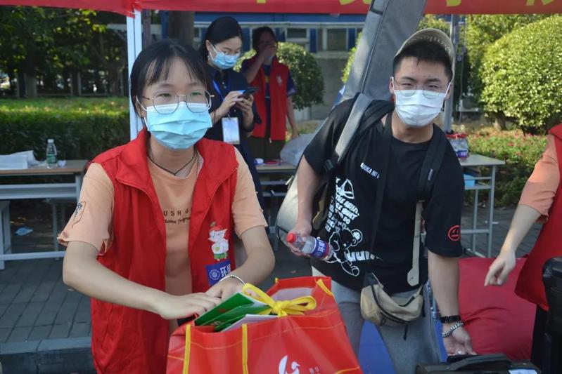 环境院的志愿者们在南门门口开始了新生入学迎新活动。现场准备了矿泉水和各类防疫物资,志愿者们满怀一腔热情,为新生引导路线并答疑解惑。
