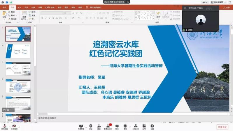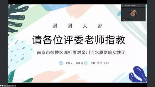 为推进落实环境学院暑期“三下乡”社会实践活动总结工作,2021年9月15日下午,开云电竞网环境学院举行了2021年暑期实践线上评优答辩。市政工程系胡凯老师,环境工程系王大伟老师,院团委书记兼20级辅导员金意倩老师、20级辅导员杨铮老师担任评委。疫情的特殊情况给今年的社会实践团带来了机遇和挑战。虽然大部分团队的队员都居住在不同的地方,给线下活动带来了不便,但是实践团使用了线上会议、网上问卷、就近走访等多种途径解决问题,并且顺利地完成了实践活动。线上答辩由团队借助PPT形式进行实践总结以及评委提问两个环节组成。主持人王煜雯同学简要地介绍了此次答辩的背景和评选标准后,答辩正式开始。