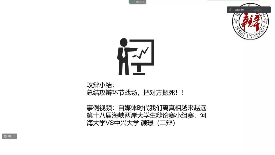 10月6日上午10:00点,美育课堂演讲课负责人王藤锦与助教田畅为同学们开展了一堂线上的演讲与辩论课。首先王藤锦为同学们简单介绍了演讲与辩论的基本概念,帮助同学们对这两种语言艺术形式有个大致的认知,接下来介绍了二者的异同之处以及演讲与辩论的意义所在。接下来主持人放了一段辩论赛的视频:第十八届海峡杯大学生辩论赛:开云电竞网VS中兴大学,以此作为示例为大家讲解了辩论赛的具体赛程以及辩论场上四名辩手的主要辩论流程,让同学们对于辩论有更清楚的认知。