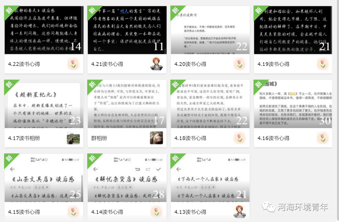 在“词海拾贝”英语文化节中,大部分同学每天打卡时长都在40分钟以上;在“书香墨韵”读书交流会中,每位同学都写出了优秀的读书心得,并在活动QQ群中交流自己对不同书籍、作家的看法。通过这次活动,我们看到了环境学院学生对英语学习和文学阅读的高度热情。