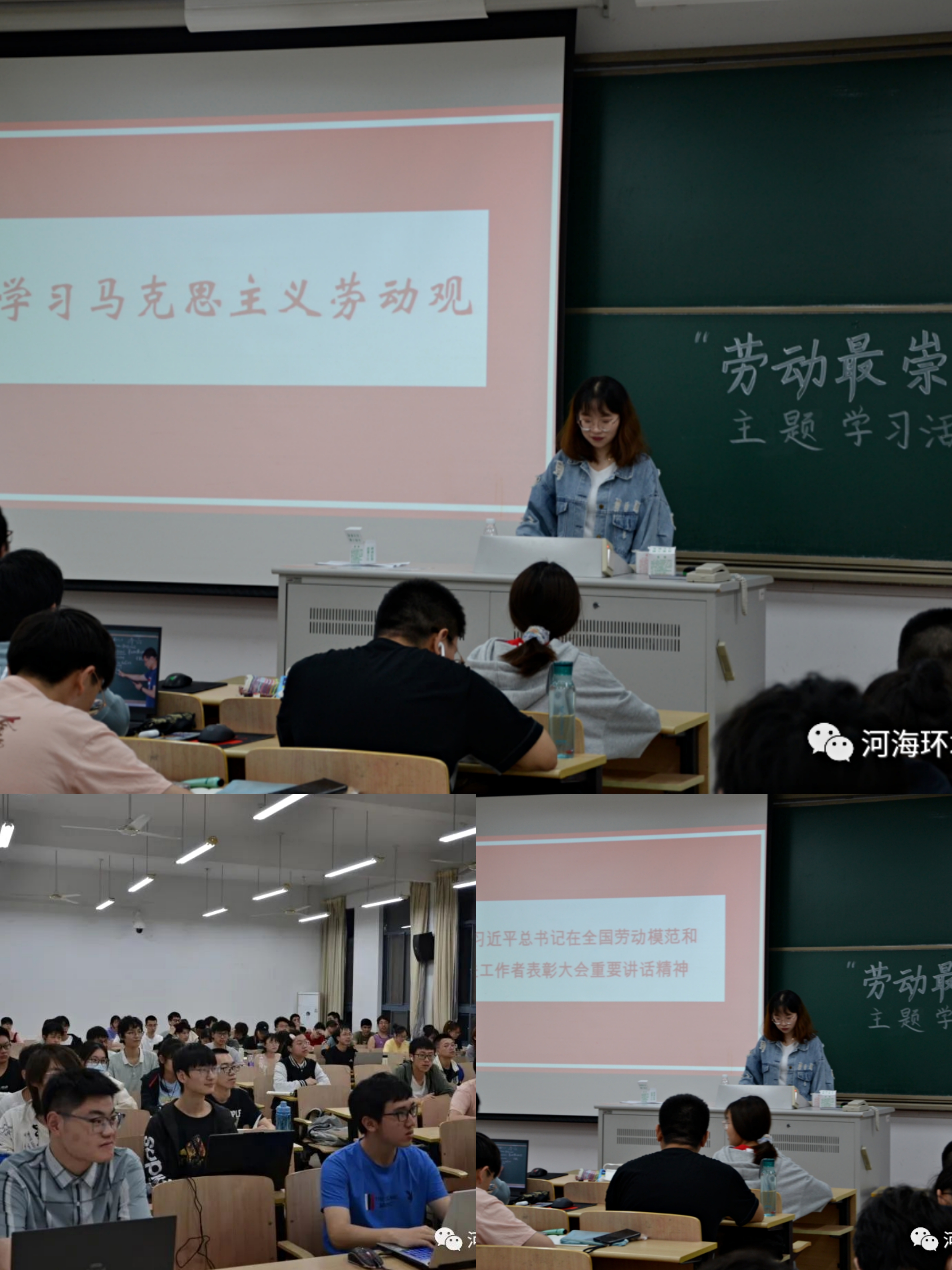 习近平总书记在全国劳动模范和先进工作者表彰大会发表重要讲话。习近平总书记强调,光荣属于劳动者,幸福属于劳动者。为深入贯彻落实习近平总书记的重要指示,帮助同学们更好地理解讲话精神,2022年5月12日晚21级给排水一班,环科一班在博学楼b420举行了“劳动最崇高”主题学习活动。本次劳动教育活动分为三个阶段进行,班级学习委员苏赫洋、楚嘉欣同学担任主持人。