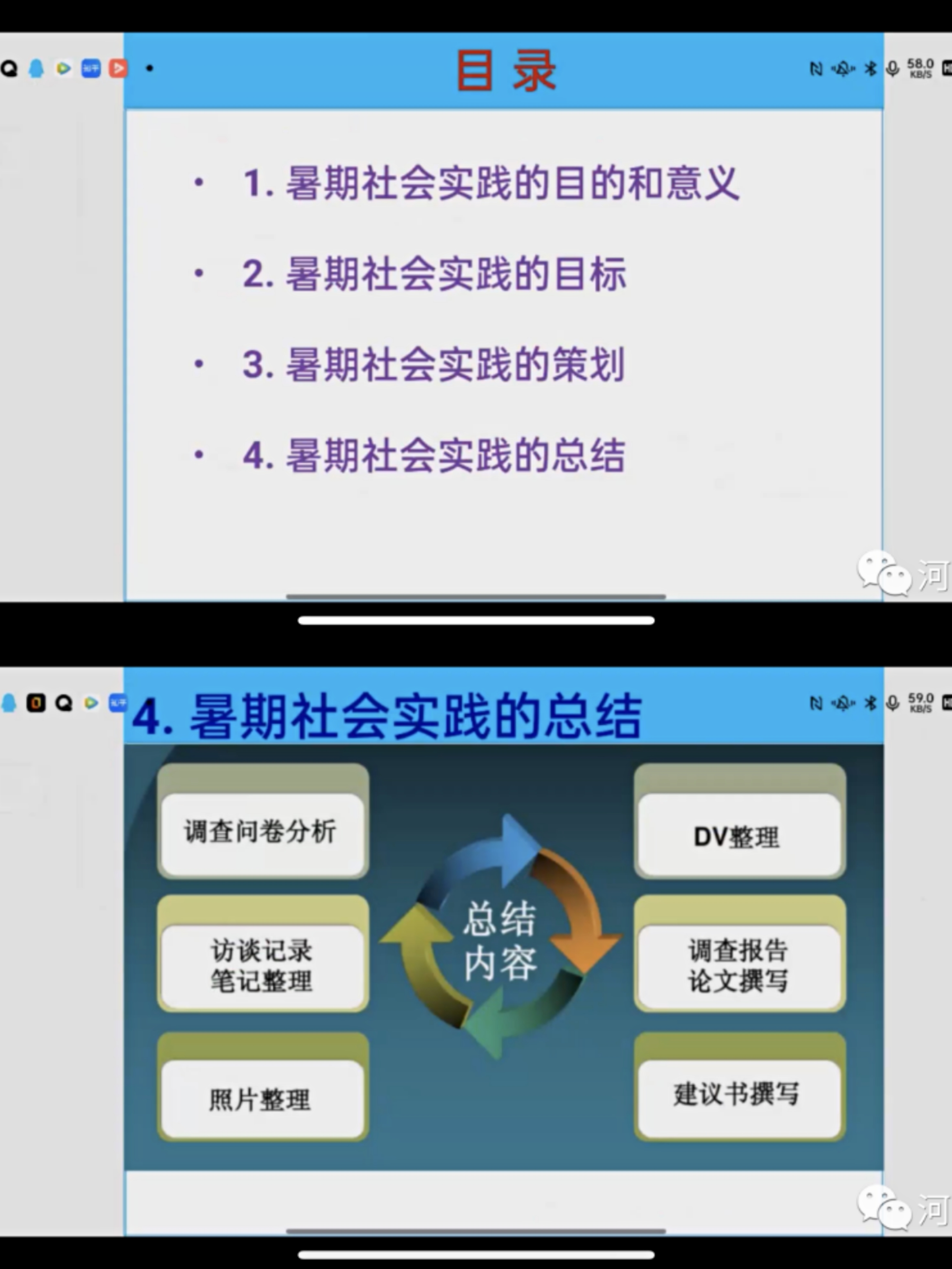 第二个环节,冯骞老师从暑期社会实践的目的和意义、目标、策划、总结四个方面做出指导。冯老师指出,暑期实践在锻炼了自己和小组成员的综合能力的同时,可以帮助同学们了解社会,为今后走上工作岗位打下坚实的基础。选题方面,冯老师建议从生活出发,结合自身专业的优势,学会聚焦,通过以小见大来实现目标。在如何进行实践这个问题上,冯老师给出了问卷调查、走访等方式,围绕着目标导向和成果导向来开展实践活动。在总结上,冯老师提出可以加入问卷中量化的数据,访谈的记录等,让总结真正有意义,有价值。